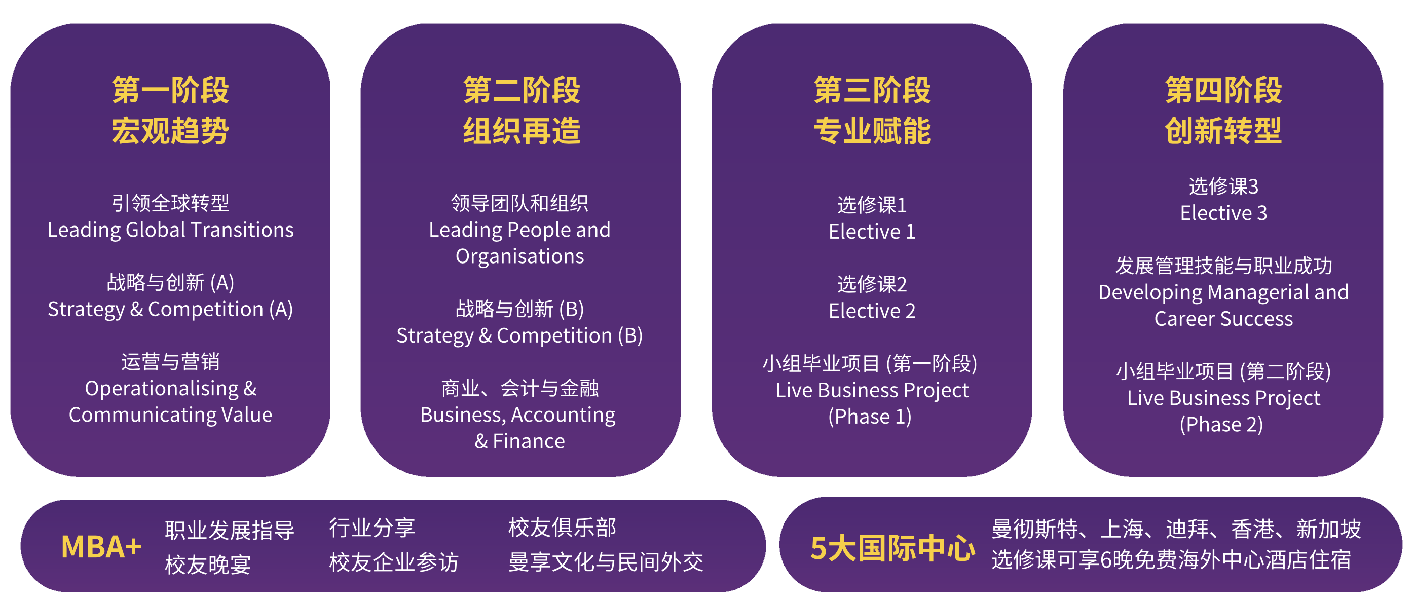 在充满不确定性的全球商业环境中,职业竞争力的本质,正在从经验积累转向持续转型的能力。曼彻斯特大学全球在职MBA致力于培养高效能的转型者——能够在复杂环境中重构认知、做出高质量决策,并将战略判断转化为组织行动力的管理者。通过系统化的商业教育与全球化学习体验,学员将建立连接中国与世界的商业思维框架,持续提升管理效能与领导力影响力,在更高层面参与价值创造与商业决策。
