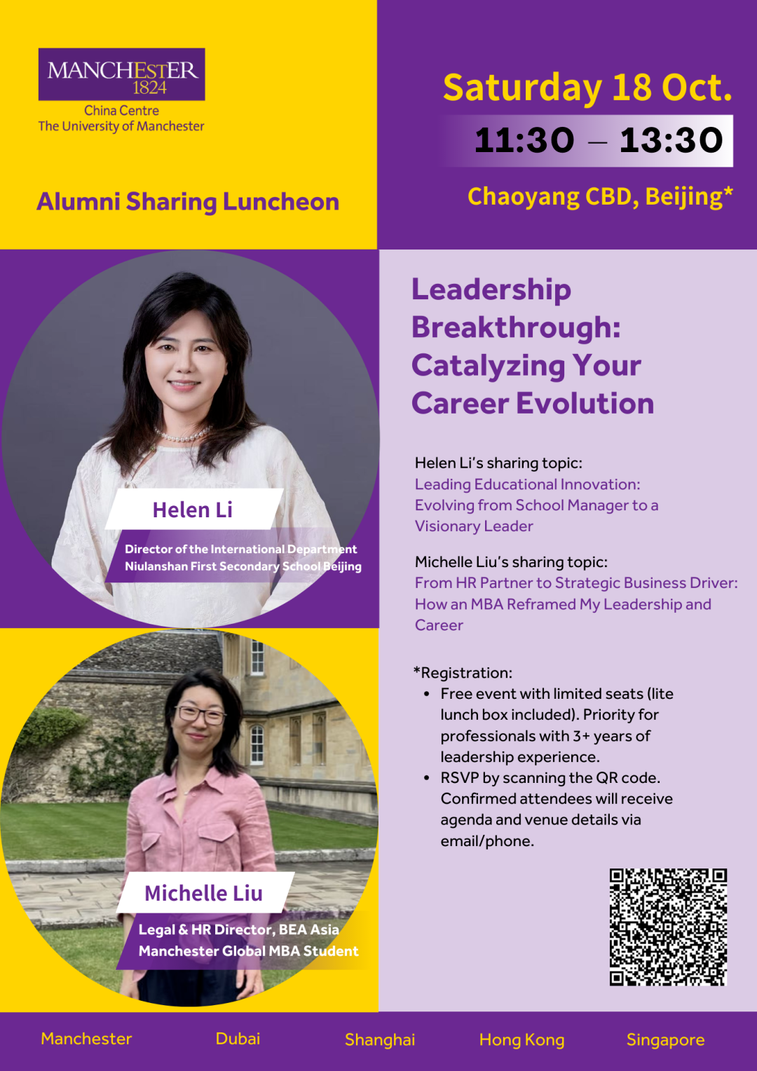 本次活动将抛开泛泛而谈的理论,聚焦于领导力发展与个人职业发展的实践转化:如何突破领导力瓶颈,从而直接驱动您的职业进阶?我们荣幸邀请到分别来自企业界与教育界的两位校友嘉宾,分享如何利用在曼彻斯特大学的在职学习经历,获得新视角、应对复杂挑战,并战略性地将职业生涯推向新高度的独特历程。