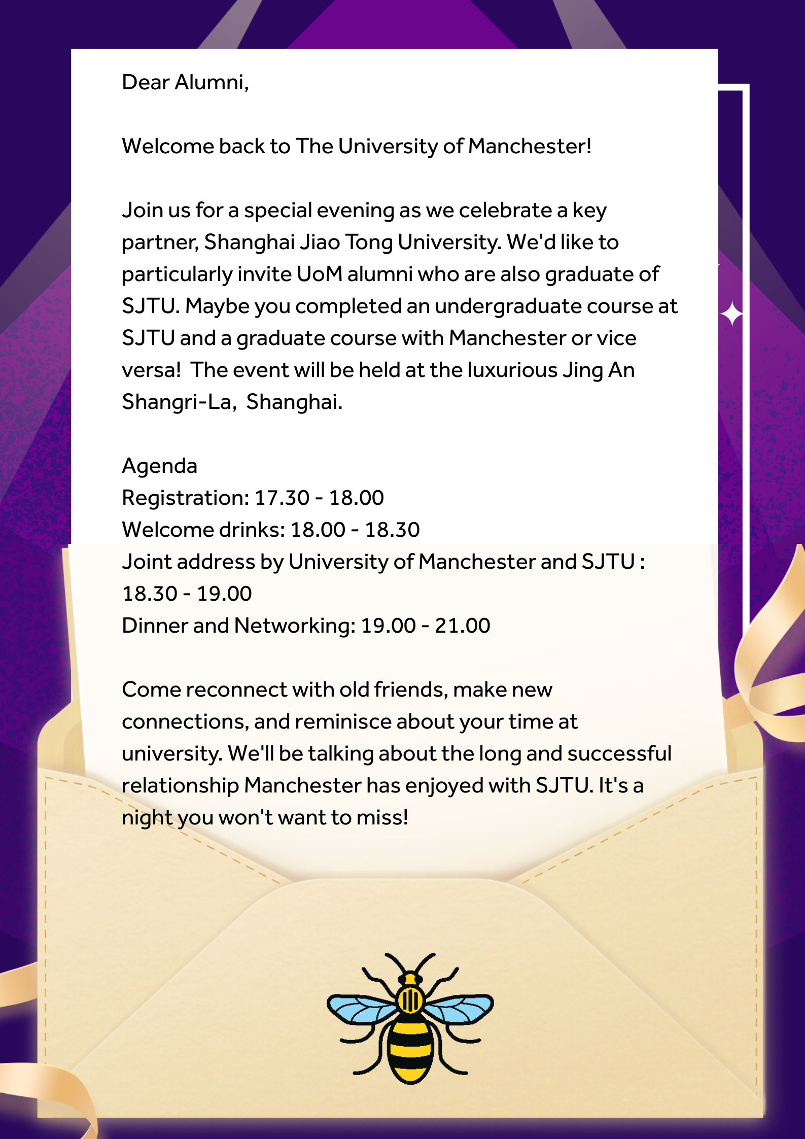 为了让更多的职场精英受益于曼彻斯特大学的优质教育,中国中心持续开展“校友推荐奖励计划”。如果您是曼彻斯特大学的在读生或校友,欢迎您把学习体验及中国中心推广的曼大在职硕士课程分享给家人、同事或朋友。
