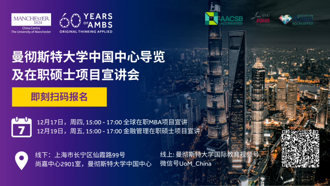 在瞬息万变的商业世界中,领导力与战略思维是驱动个人与组织持续成功的核心力量。如果您正希望通过在职MBA学习或金融管理来加速职业发展、拓展国际视野,却仍在寻找最契合自身目标的项目,欢迎参加曼彻斯特大学课程咨询团队带来的曼大商学院在职项目说明会和上海中心导览活动。