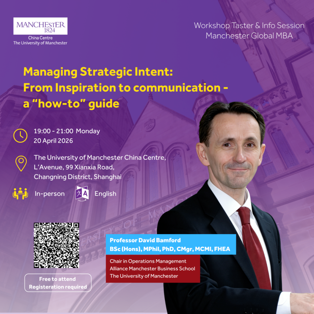 企业战略如何从“灵感”走向“落地”?在现实管理实践中,许多组织并不缺战略愿景,而是缺少能够指导实际决策与执行的战略运营意图(Strategic Operational Intent)。如果你正在思考如何提升自己的战略思维能力,或希望提前体验一次真正的 Manchester Global MBA 课堂氛围,那么这场即将在曼大上海中心举办的公开大师课将是一次非常值得参加的机会。