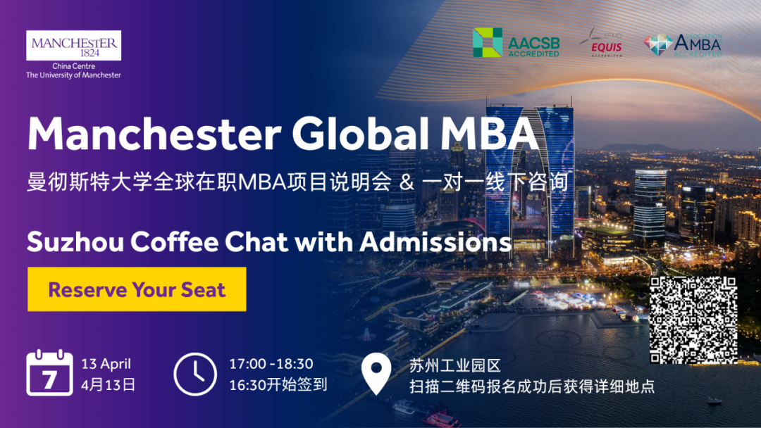 如果您正希望通过MBA学习来加速职业发展、拓展国际视野,却仍在寻找最契合自身目标的项目,4月13日傍晚,我们在苏州金鸡湖边,为你开启一场轻松而真诚的Coffee Chat和项目说明会。没有舞台,没有距离,只有面对面的交流和沟通。
