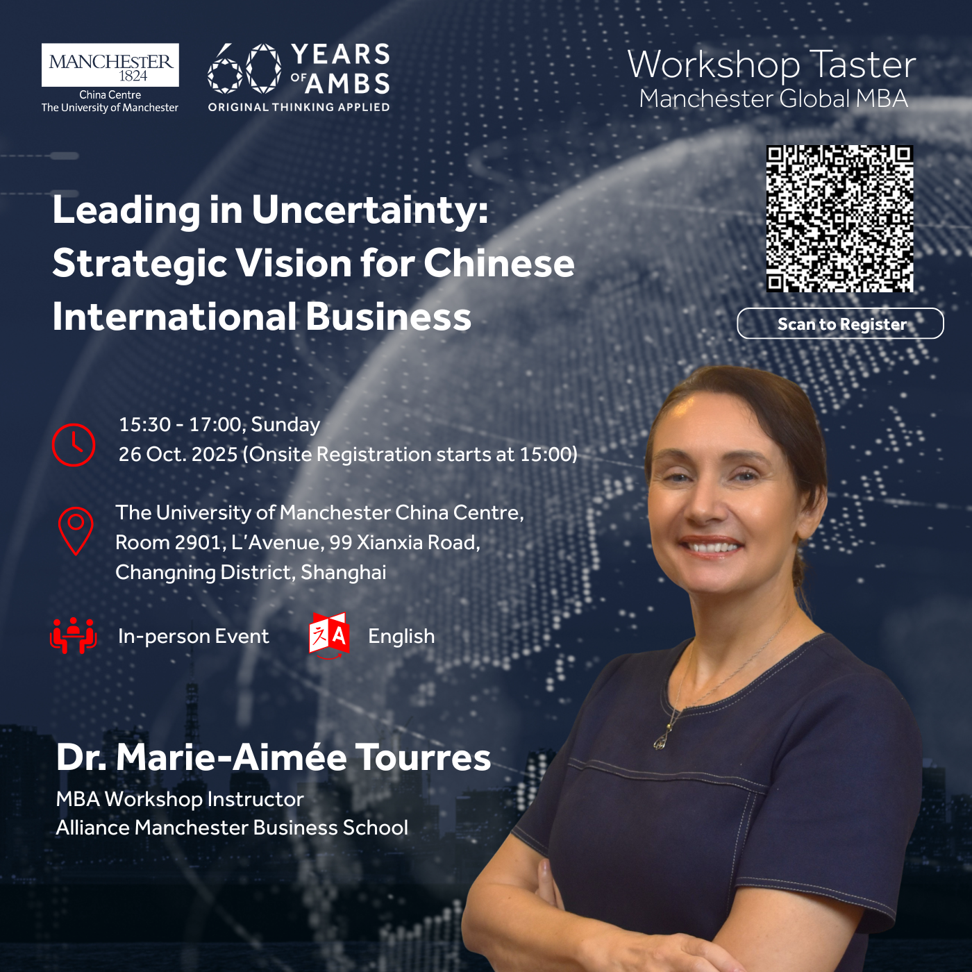 在变换莫测的世界大局下,如何跳出本土框架,以全球视野御前行?企业领导者又该如何依靠远见,将全球性风险转化为机遇?曼彻斯特大学中国中心特邀MBA课程讲师Dr. Marie-Aimée Tourres,带来深度分享工作坊,聚焦变革中的领导力策略,为未来商业领袖提供前沿洞察。