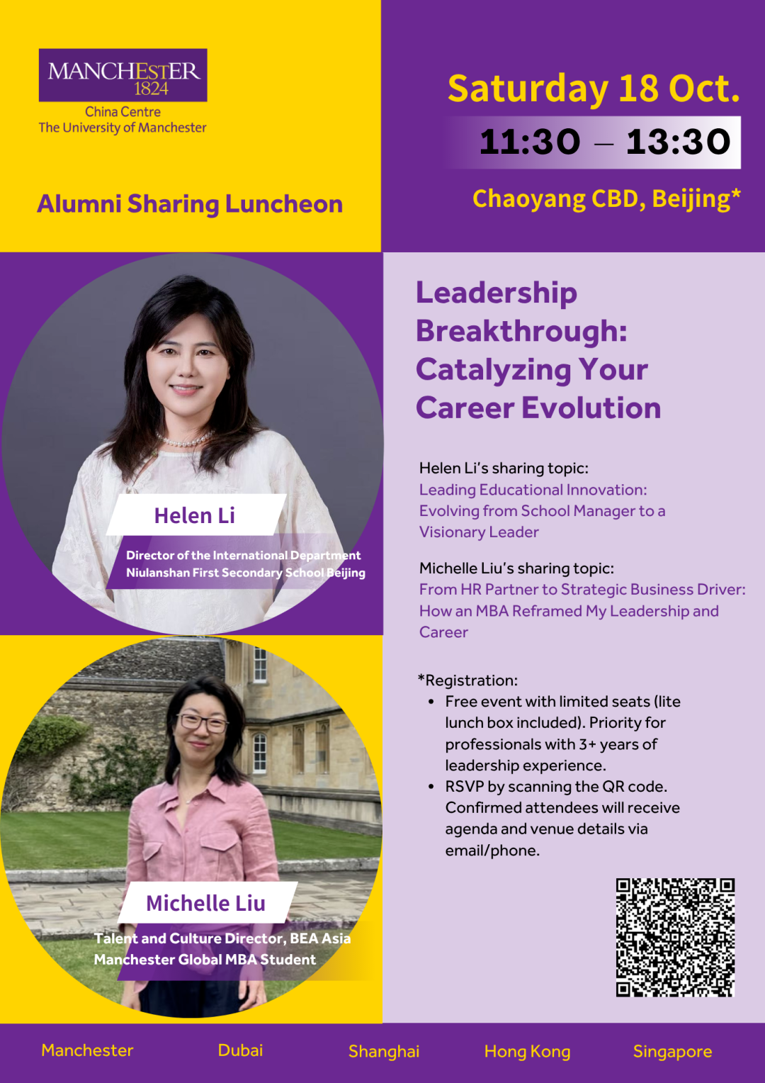 本次活动将抛开泛泛而谈,聚焦于领导力发展与个人职业发展的实践转化:如何突破领导力瓶颈,从而直接驱动您的职业进阶?我们荣幸邀请到分别来自企业界与教育界的两位校友嘉宾,分享如何利用在曼彻斯特大学的在职学习经历,获得新视角、应对复杂挑战,并战略性地将职业生涯推向新高度的独特历程。