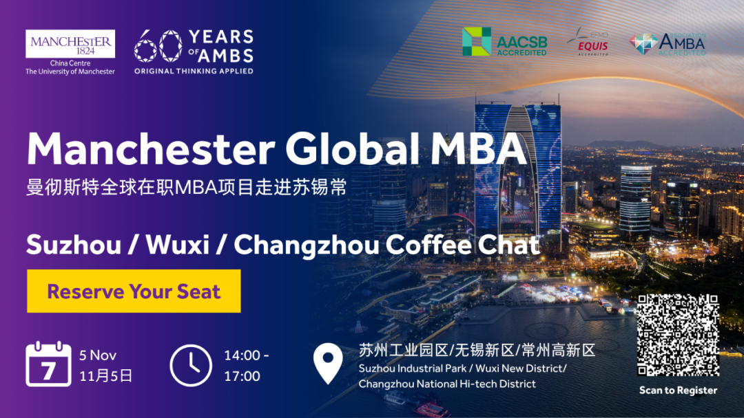 如果您正希望通过MBA学习来加速职业发展、拓展国际视野,却仍在寻找最契合自身目标的项目,欢迎参加11月5日(周三)下午由曼彻斯特大学课程咨询团队带来的苏州、无锡、常州宣讲会与一对一 Coffee Chat 活动。