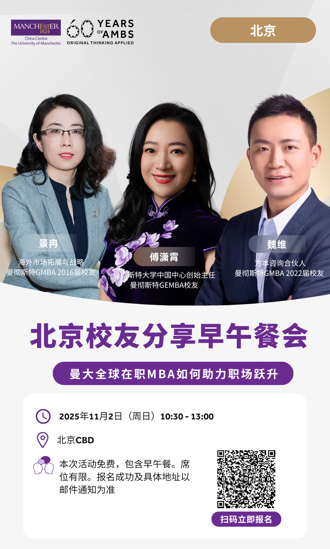 11月2日(周日)上午,曼彻斯特大学中国中心主任傅潇霄女士将携优质商业教育来到北京,诚邀有志成为管理精英的国际化商业人士,与我们面对面交流。同时,我们也邀请到身在北京的优秀校友——魏维(Will Wei)先生和景冉(Joanna Jing)女士,分享学习历程与收获,共同探讨如何通过曼大在职MBA教育,全面提升战略视野、商业敏锐度与领导力思维,从而助力职业跃升,在多变的时代中保持长期竞争力。