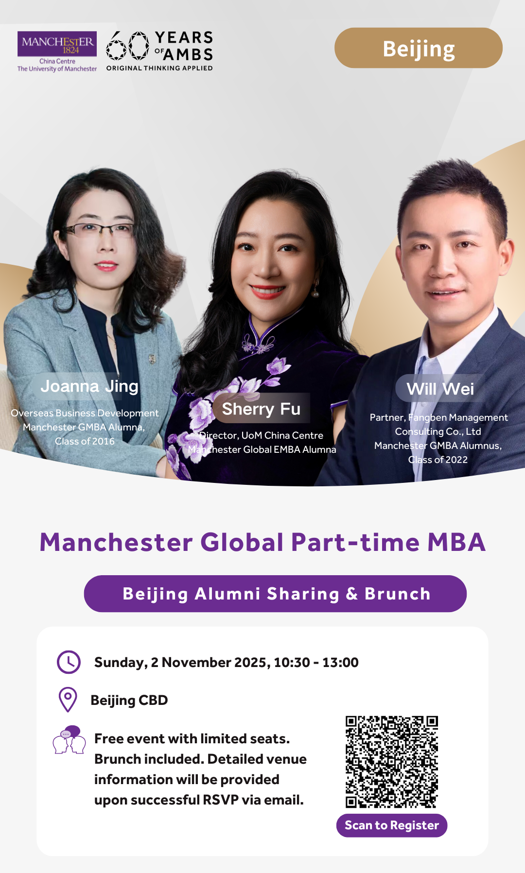 On 2 November (Sunday) morning, Ms. Sherry Fu, Director of the University of Manchester China Centre, will bring world-class business education insights to Beijing. She will be joined by distinguished alumni Will Wei and Joanna Jing, who will share their MBA learning journeys and discuss how the Manchester Global MBA empowers professionals to expand strategic vision, sharpen business acumen, and strengthen leadership skills — driving meaningful career progression and long-term competitiveness in an ever-changing world.