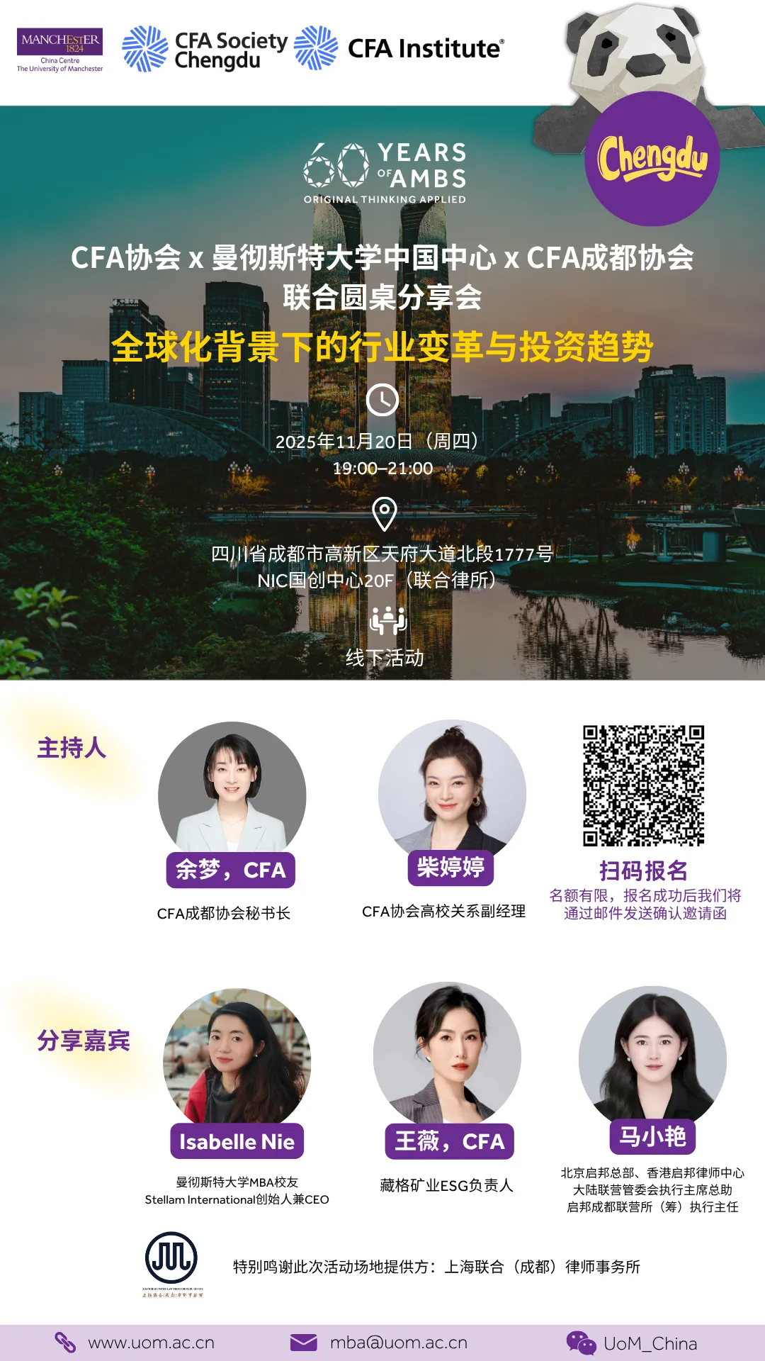 全球经济格局不断演变,企业“出海”、可持续投资与ESG、金融科技与合规监管等话题成为行业焦点。11月20日,CFA协会、CFA成都协会与英国曼彻斯特大学中国中心相聚成都,将联合举办主题为“全球化背景下的行业变革与投资趋势” 的行业圆桌分享会,邀请来自金融、法律、实业等领域的嘉宾,共同探讨全球化进程中的机遇与挑战。