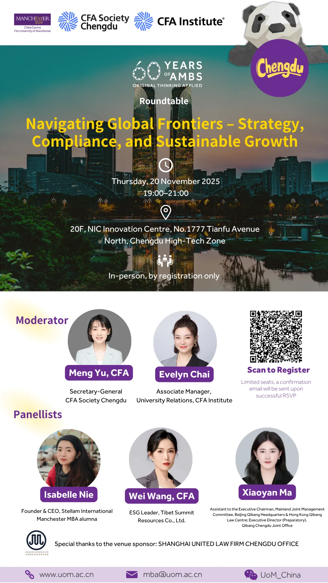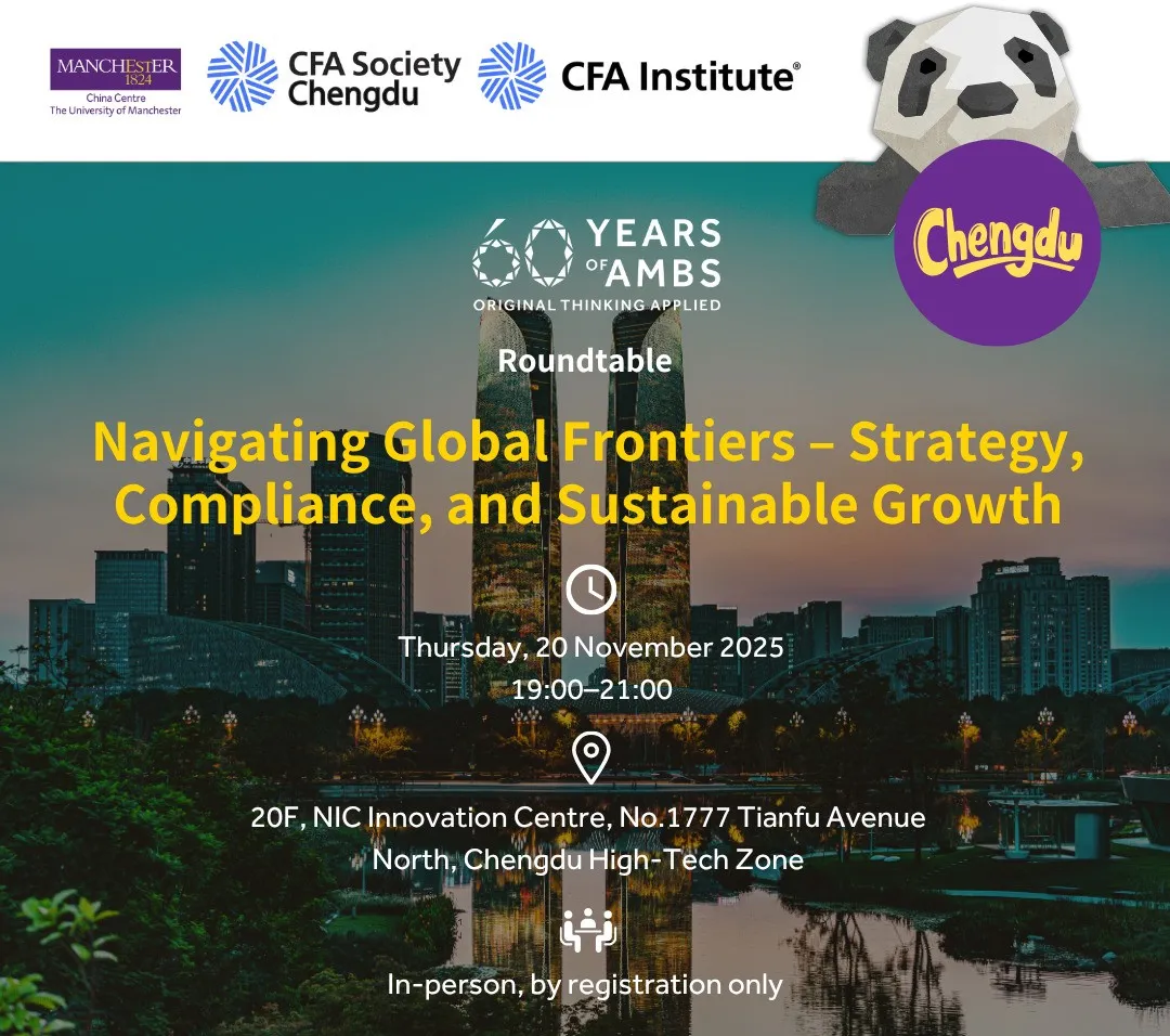 On 20 November 2025, the CFA Institute, CFA Society Chengdu, and The University of Manchester China Centre will jointly host a closed-door roundtable discussion themed “Navigating Global Frontiers – Strategy, Compliance, and Sustainable Growth.”