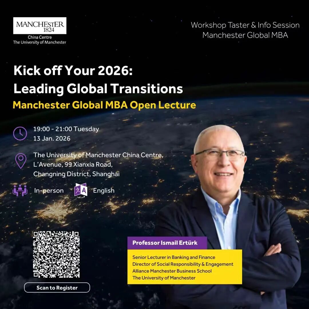 欢迎报名参加曼彻斯特大学中国中心于 1 月 13 日晚 举办的曼彻斯特全球在职 MBA 公开课。本次课程特邀曼彻斯特大学商学院 Ismail Ertürk 教授主讲,他将以 《引领全球转型》 为主题,带你深入理解全球商业与经济转型的现实背景,以及社会责任与商业伦理如何成为当代战略管理的核心议题。