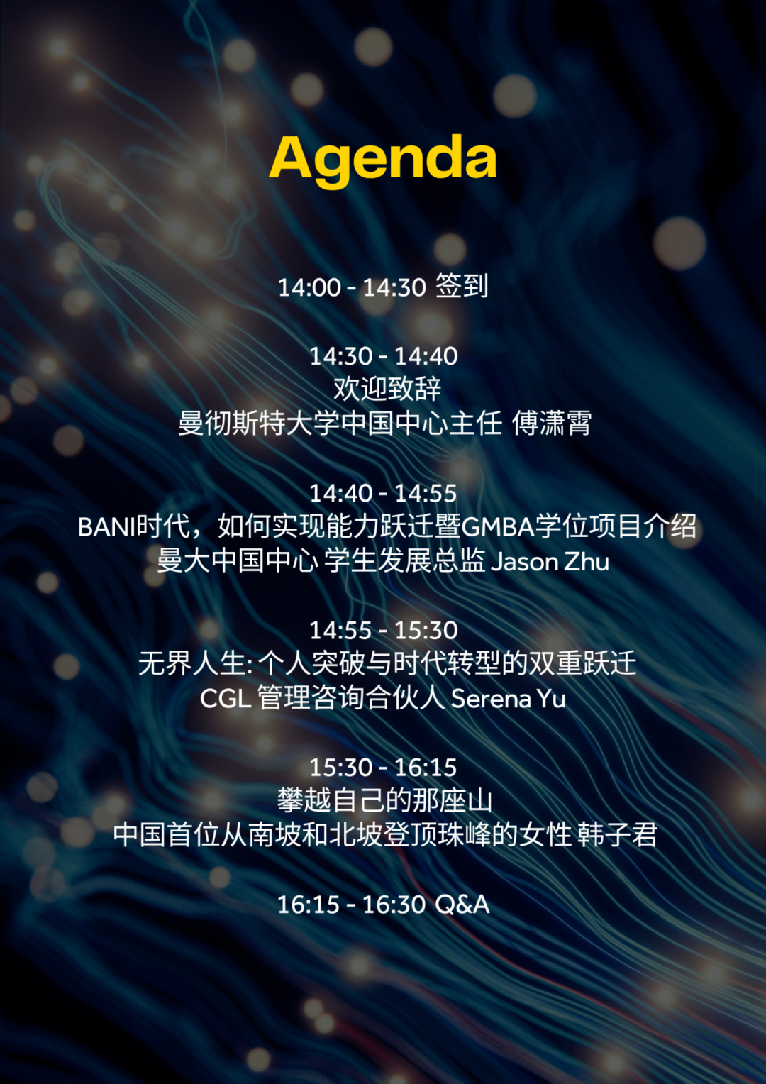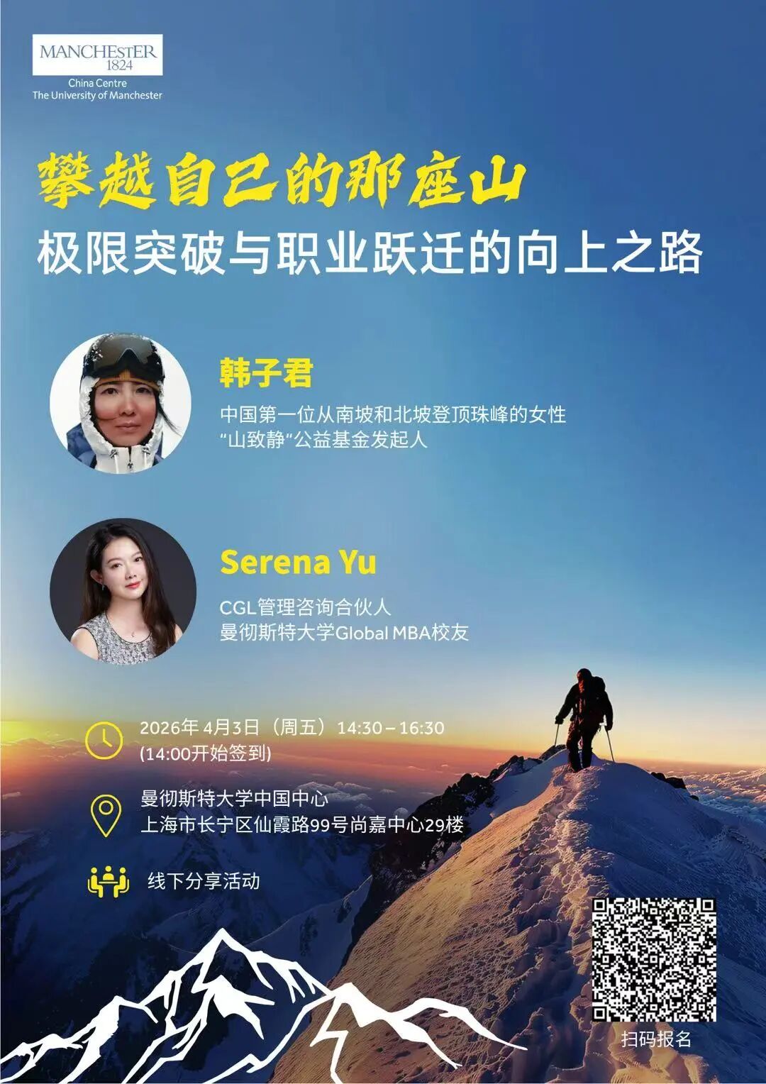 4月3日(星期五)下午,我们将邀请中国首位分别从南北坡成功登顶珠峰的女性代表韩子君女士和CGL管理咨询有限公司合伙人、曼彻斯特大学全球MBA校友Serena Yu女士为我们带来一场关于勇气、坚持与超越的深度对话。欢迎大家报名。