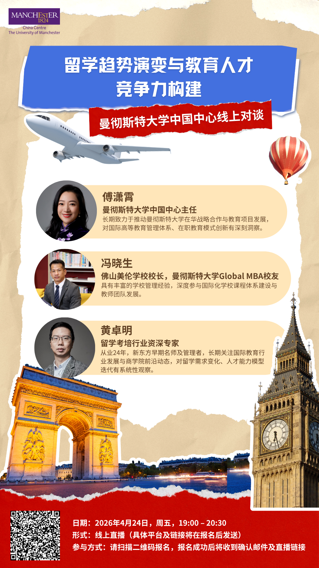 在全球高等教育格局持续变化、人工智能技术深度介入教育行业的背景下,留学市场与国际教育人才发展正面临新的挑战与机遇。2026年4月24日,曼彻斯特大学中国中心将进行线上专题对谈,邀请三位国际教育行业资深实践者,共同探讨留学趋势走向,以及国际教育从业者如何在变局中持续提升自身竞争力。