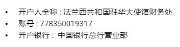 第七步:信息全部填写完毕就可以点击确认“法国高等教育署确认我的资料”,等待高教署确认。通常一周内会收到支付预签证费的邮件,法国留学预签证程序费用为人民币2900元。申请人需要转账到法国大使馆财务处的账号: